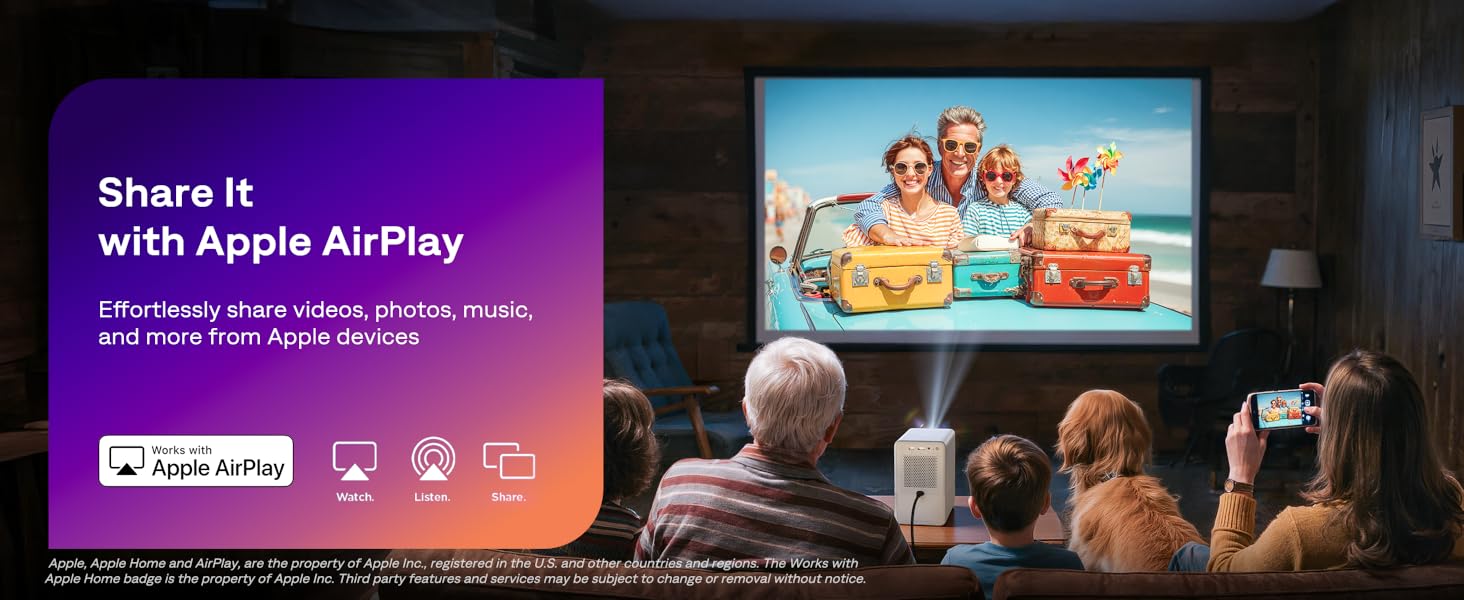 WiFi | Bluetooth | 1080P / 4K | Dolby Audio | Apple AirPlay | Portable Mini Projector | Home & Outdoor Movies | Netflix | Google Home | Alexa