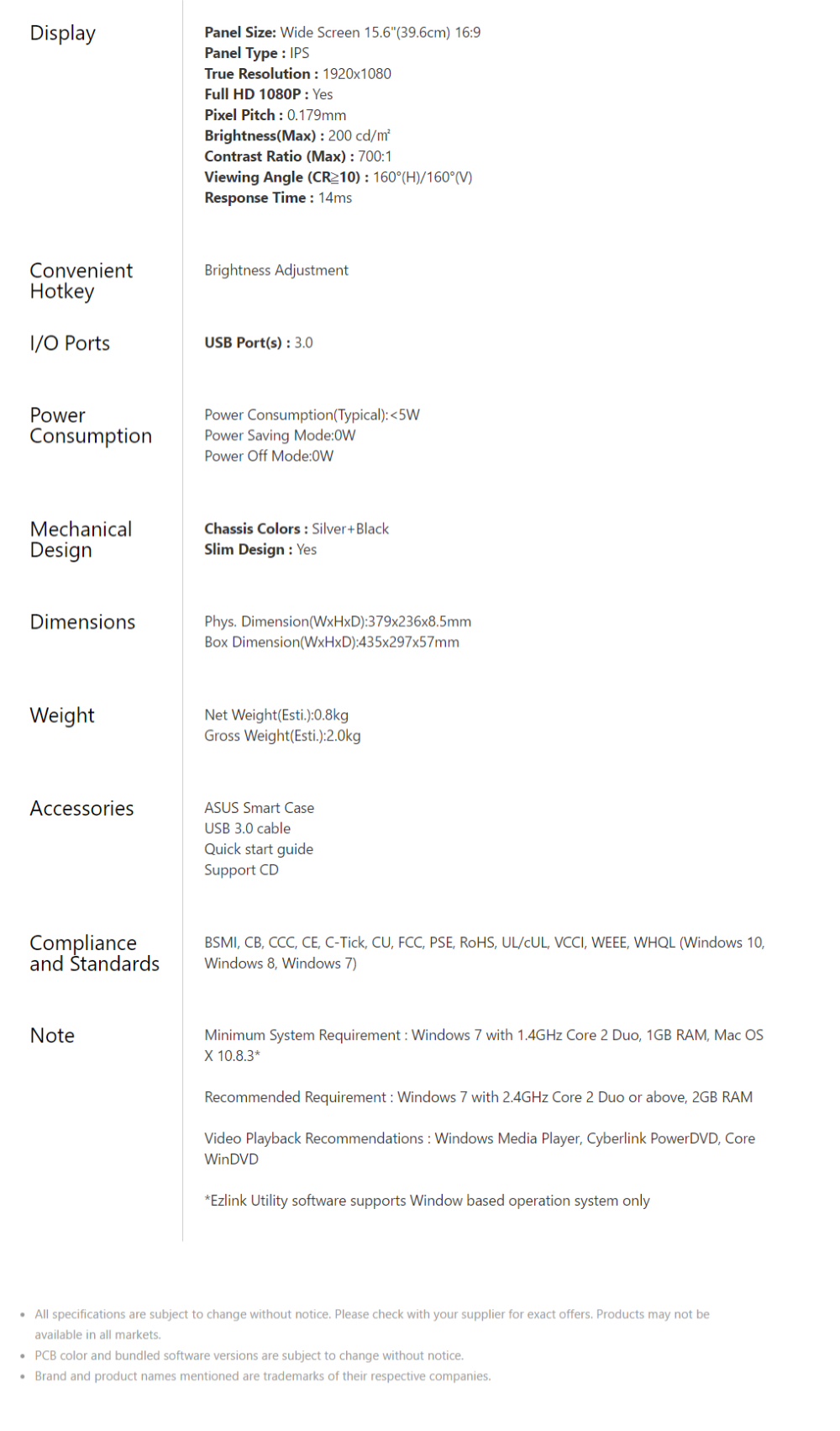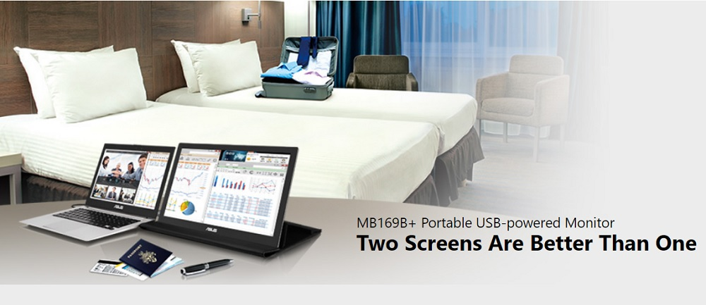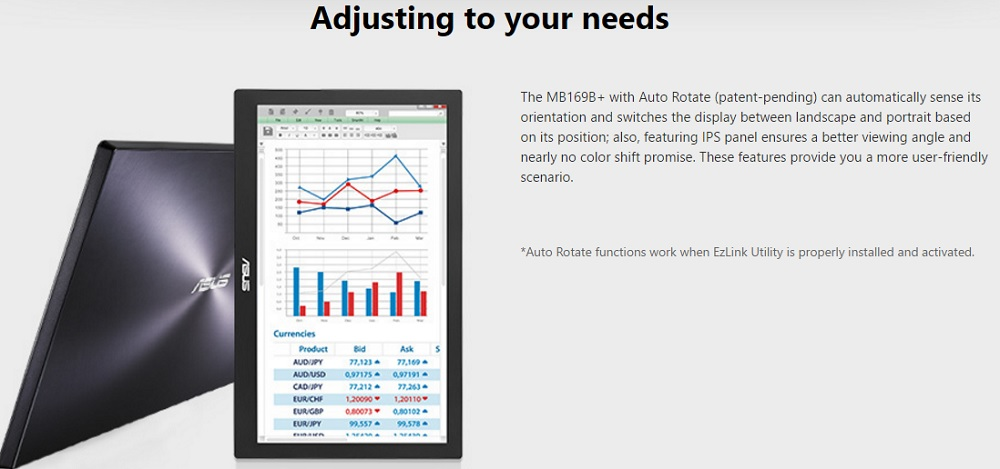 The World's slimmest and lightest 15.6" Full HD IPS panel USB powered MB169B+ Portable Monitor with a single USB 3.0 cable for power and data transmission. MB169B+ features EzLink technology and Auto rotating display bundled with the ASUS Smart Case a two way adjustable stand and protective sleeve provide a more user friendly scenario. IPS is a type of panel technology of that provides a wide field of view. Based on the principle that liquid crystal polymer runs horizontally, this allows for good viewing at wide angles and a fast response speed.