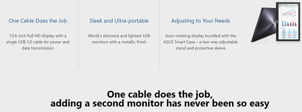 15.6 inch Full HD portable USB powered monitor with a single USB 3.0 cable for power and data transmission