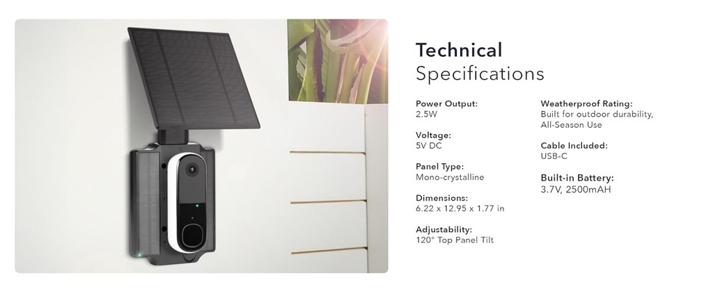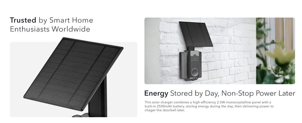 A smart solar charging solution with built-in battery backup, perfect for keeping your security doorbells and cameras powered 24/7.4/7.