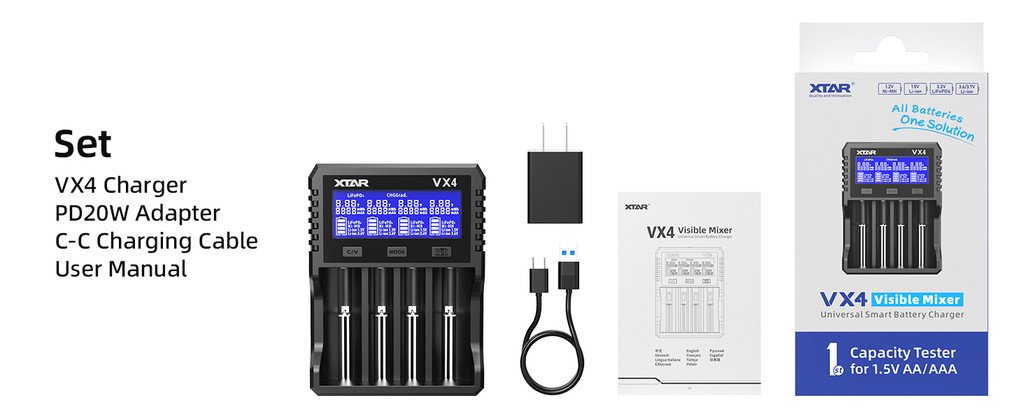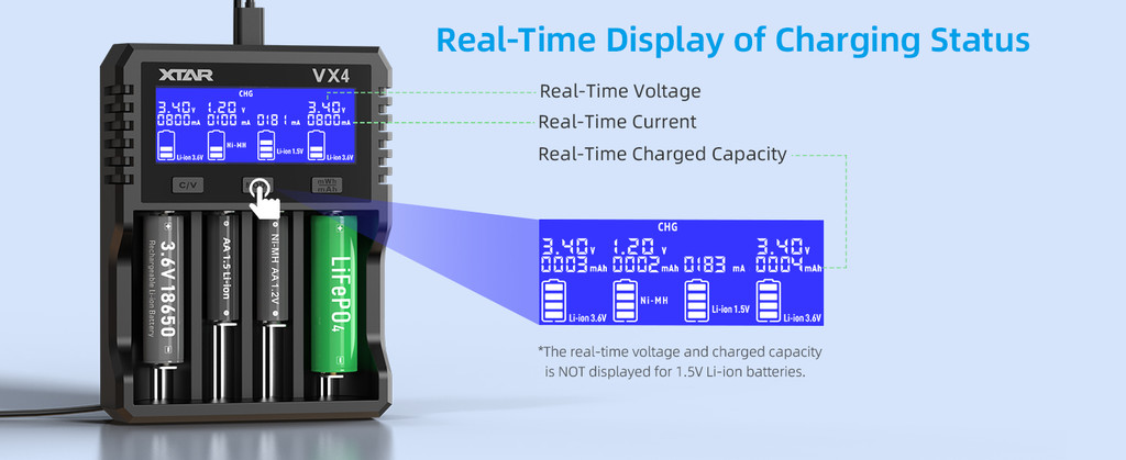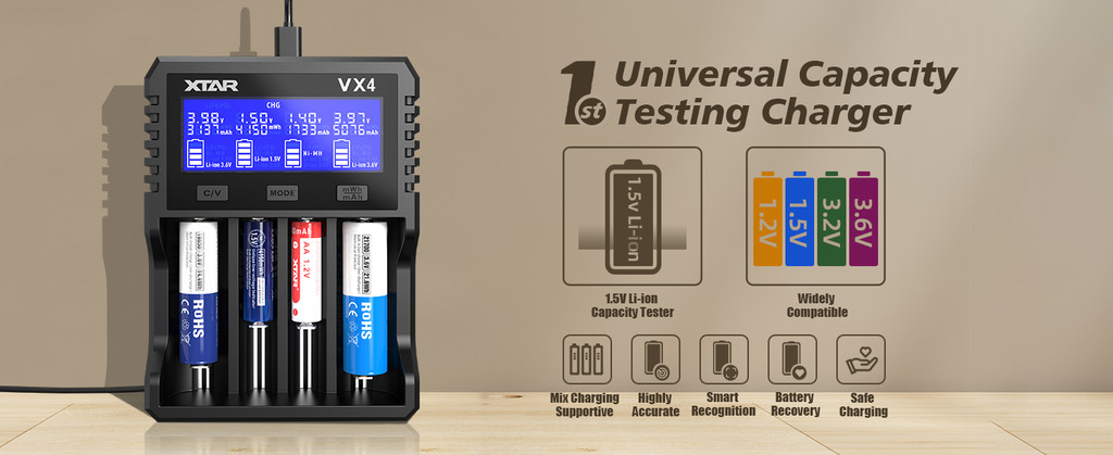 XTAR VX4 Visible Mixer 1.5V/3.6V/3.7V Li-Ion 3.2V LiFePO4 1.2V Ni-MH Battery Charger, Capacity Tester