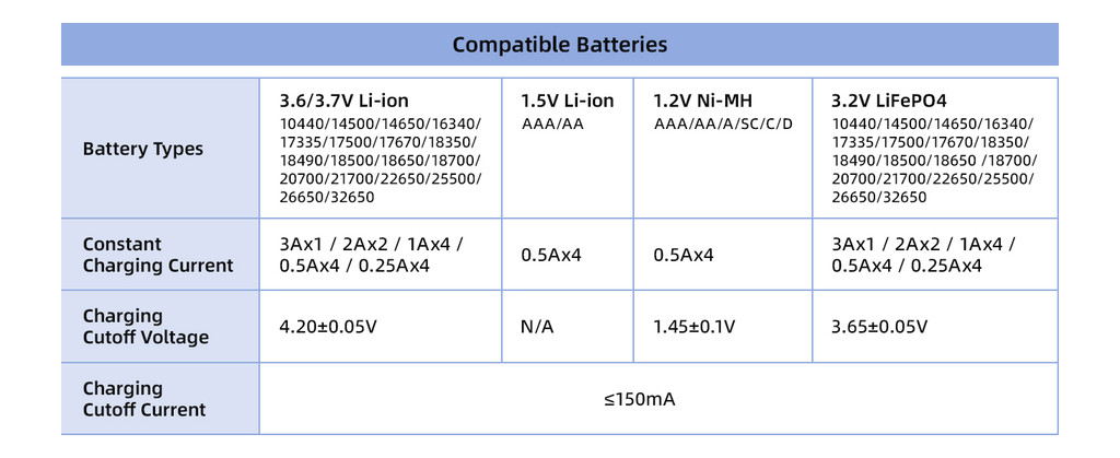 Universal Compatibility: Works with 1.5V / 3.6V / 3.7V Li-Ion, 3.2V LiFePO4, and 1.2V Ni-MH rechargeable batteries